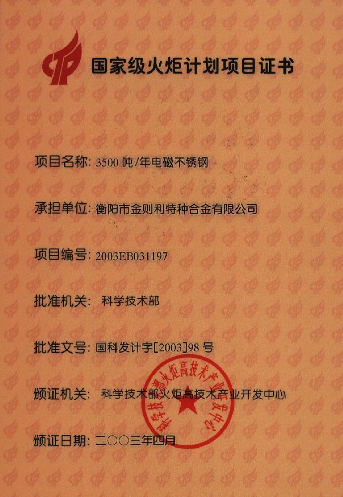 • 國家級火炬計(jì)劃項(xiàng)目證書